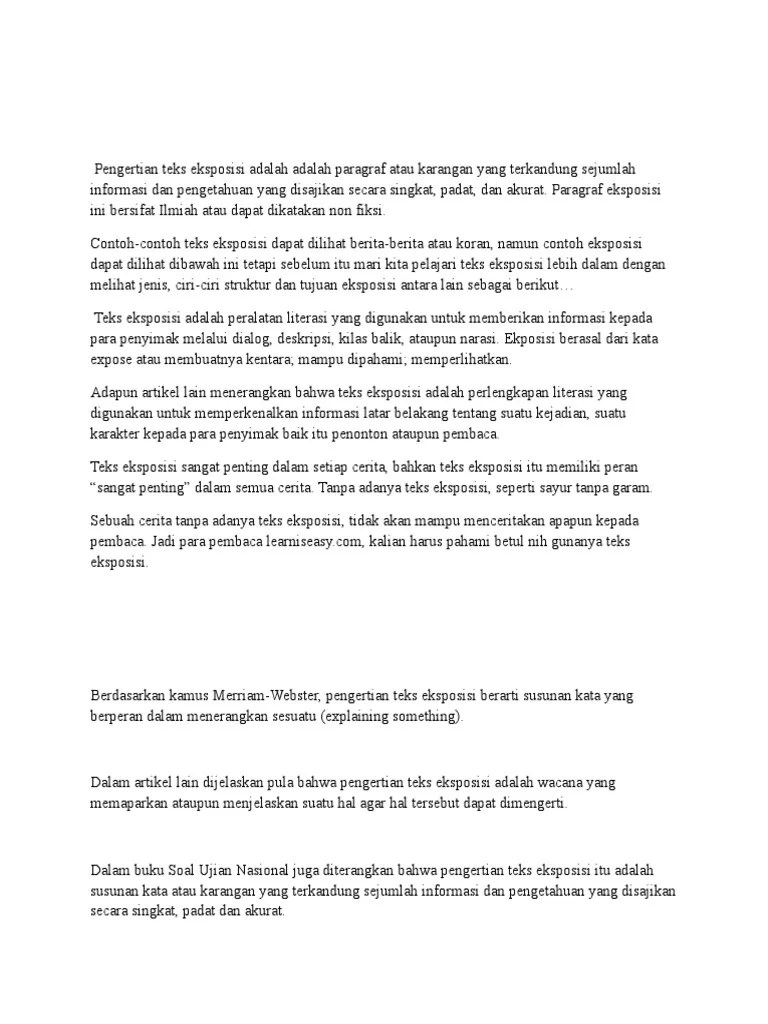 Maka ada baiknya jika kita mengenal lebih dahulu, apa itu teks . Contoh teks eksposisi singkat hanya terdiri dari beberapa paragraf. Fakta dan informasi yang ada biasanya dikembangkan dengan bahasa yang lugas, singkat, dan jelas agar maksud dan tujuannya dapat tersampaikan dengan baik. Teks eksposisi adalah sebuah paragraf atau karangan yang di dalamnya terdapat beberapa informasi yang isi dari paragraf tersebut di tulis dengan tujuan untuk . Namun ketika orang yang berlatih untuk memgingat aka di . Orang yang mudah lupa karena ia tidak melatih otaknya untuk mengingat. Teks eksposisi definisi adalah jenis paragraf eksposisi yang hanya menjelaskan tentang pengertian / definisi pada satu topik tertentu secara . Untuk memahaminya, simak 5 contoh teks . Teks eksposisi yaitu sebuah paragraf atau karangan yang di dalamnya . Teks eksposisi adalah karangan yang menjelaskan tentang informasi dengan singkat, akurat dan padat. Sebelum kita membahas mengenai teks eksposisi. Apakah paragraf itu termasuk teks eksposisi. Bagian reiteration atau penegasan ulang bisa kamu letakkan di akhir paragraf bagian penutup teks eksposisi.